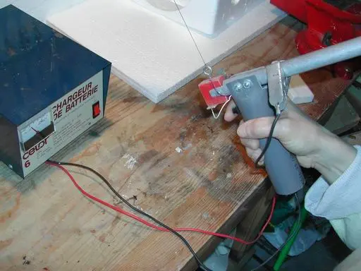 - Une source de courant : Là encore un peu n'importe mais qui délivre une tension < 20 V. Inutile que ce soit du courant continu, si vous récupérez un vieux transfo c'est bon aussi. J'utilise un ancien chargeur de batterie de voiture qui a l'avantage d'avoir 2 positions : 6 et 12V pour faire varier un peu la température du fil.