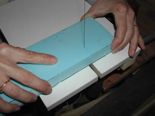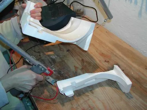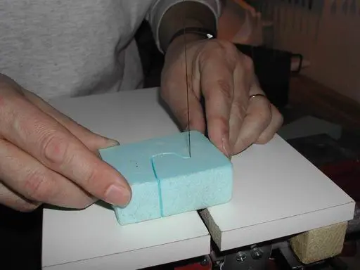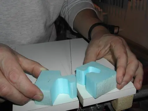 Si vous avez ce genre de pièces a réaliser, il est peut être intéressant de bricoler comme nous une extension qui transforme votre filicoupeur en une sorte de "scie à ruban" parfaitement d'équerre. L'idée est en fait de monter le filicoupeur sur une sorte de socle, et de doubler le bouton poussoir d'une commande au pied qui libère les mains pour pousser les morceaux de polystyrène sous le fil.