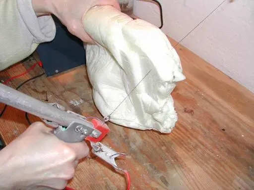 Le principe est très simple, on fait passer un courant assez fort dans un fil résistant très fin. Le fil sous l'action du courant, chauffe et se comporte comme un "fil à couper le beurre" pour le polystyrène, et le coupe de façon nette et sans bavures : résultat impossible à obtenir avec un cutter ou un couteau, surtout pour de grosses pièces (>5 cm d'épaisseur).