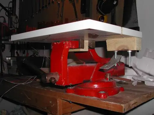 Pour cela il vous faut faire une tablette de coupe, qui sera percée d'un trou pour laisser passer le fil de coupe. Le filicoupeur et la tablette de coupe devront être à l'équerre, solidaires et stables, par exemple maintenus dans un étau.
