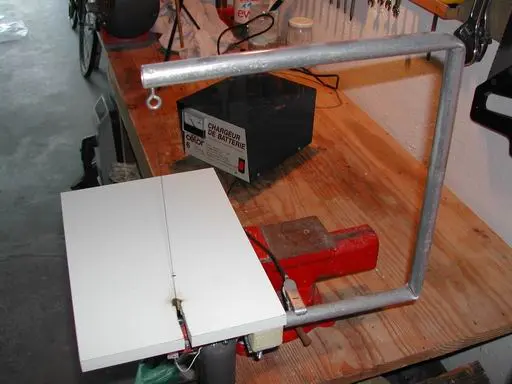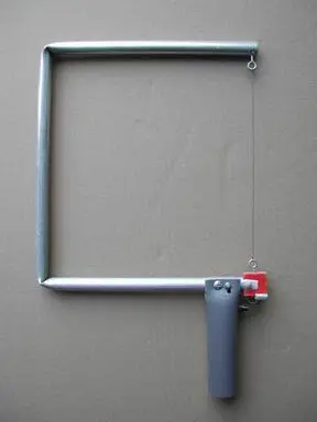 Et bien sur monter le tout sur une structure isolante facile à manipuler pour pouvoir bien diriger le fil chaud pendant les phases de coupe. L'idée était de faire quelque chose qui ressemble un peu à une scie à fil, bien connue des modélistes. C'est une sorte de grand "U" qui possède une poignée à son extrémité.