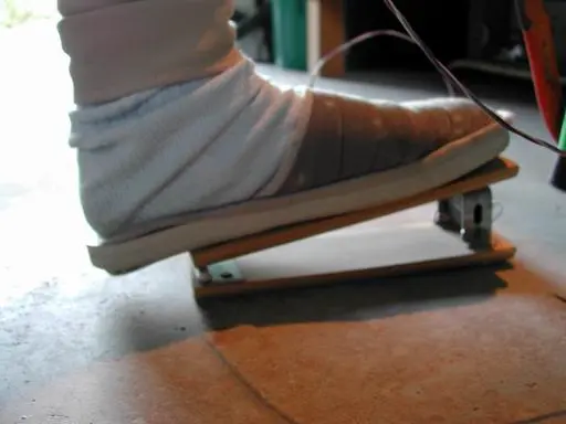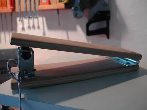 Découpez la poignée dans le tube plastique à vos mesures. Découpez, à la scie à métaux, sur le dessus une gorge de la largeur du tube utilisé pour faire le "U". Percez un trou (du diamètre de votre bouton poussoir) qui tombe sous votre index, comme une gâchette. Raccordez 2 fils au bouton poussoir, et montez le dans la poignée.