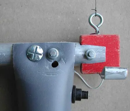 Montez le "U" dans la gorge de la poignée, faites le dépasser de 2 cm environ et fixez le solidement en perçant deux trous cote à cote à travers le plastique. Faites y passer 2 boulons et serrez avec 2 écrous de l'autre coté. Vous devez avoir quelque chose de léger en main avec le bouton poussoir facilement sous le doigt.