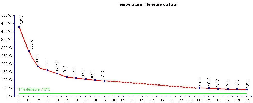 La mesure commence à H0, après deux heures de chauffe, quand on retire toutes les braises du four, à ce moment il fait 430°C ou 806°F (et 15 °C ou 59°F dehors ce jour là).